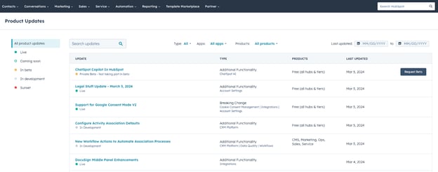 Finding specific updates within your portal just got easier. HubSpot has implemented a new interface with search functionality, allowing you to filter updates by type, app, or subscription level. Additionally, left-hand side filters based on update status provide further organization.