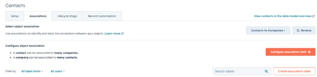 Admins can now configure the number of associations allowed for specific object records. This includes setting limits based on record type and creating custom association labels. For example, when looking at company-to-contact associations, you can customize the limit of companies per contact, or vice versa.